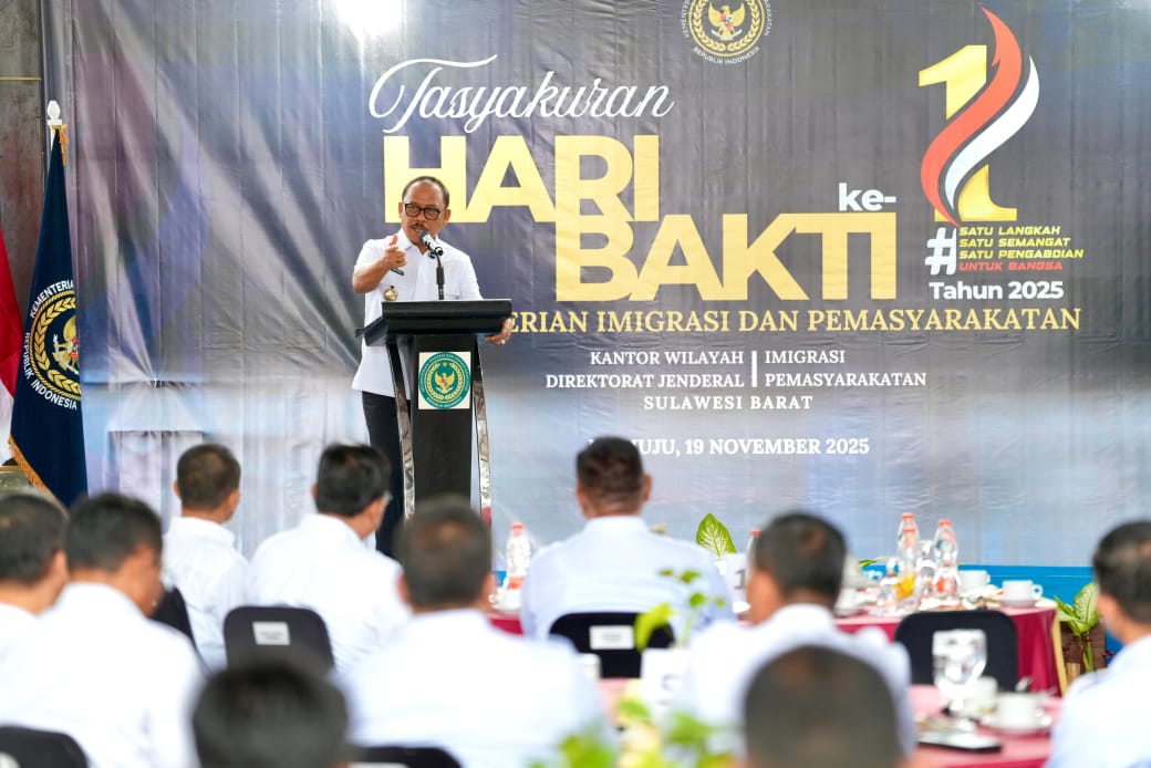 Mamuju, ide-ta.com – Gubernur Sulawesi Barat (Sulbar), Suhardi Duka menghadiri tasyakuran Hari Bakti ke-1 Kementerian Imigrasi dan Pemasyarakatan Kantor Wilayah (Kanwil) Direktorat Jenderal Imigrasi dan Pemasyarakatan Sulbar, Rabu, 18 November 2025.