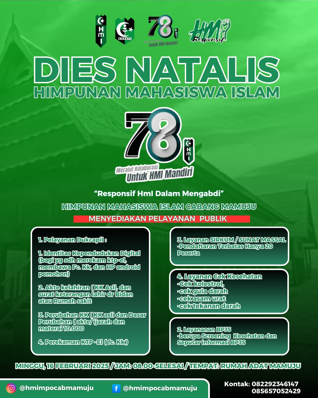Mamuju, ide-ta.com – Himpunan Mahasiswa Islam (HMI) Cabang Mamuju akan memperingati Dies Natalis HMI Ke-78 di rumah adat Mamuju, Minggu 16 Februari 2025.