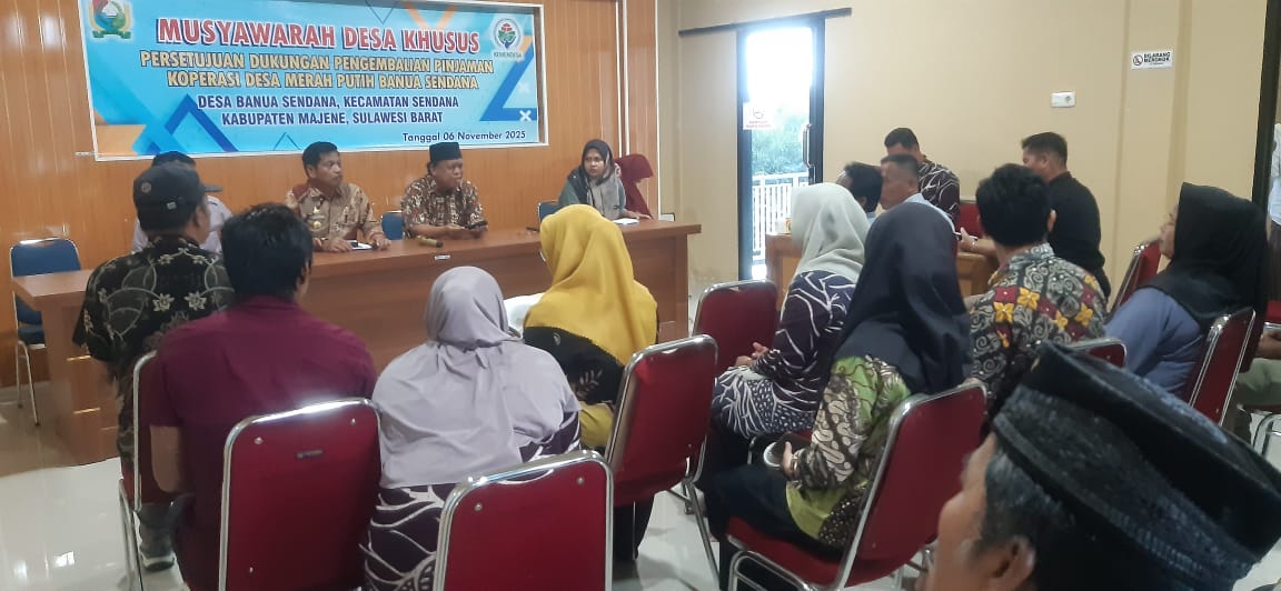 Musyawarah desa khusus, persetujuan dukungan pengembalian pinjaman Koperasi desa merah putih Banua Sendana, dilaksanakan diaula kantor desa Banua Sendana. Kamis (06/11).