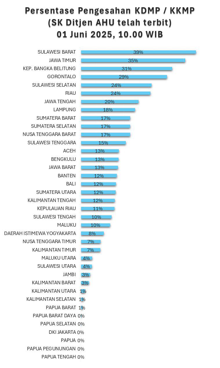 Mamuju, ide-ta.com – Direktorat Jenderal Administrasi Hukum umum (Ditjen AHU) Merilis data terkini sekira pukul 10.00 WIB, Minggu, 1 Juni 2025. Persentase pengesahan Koperasi Desa Kelurahan Merah Putih (KDMP) dan Koperasi Kelurahan Merah Putih (KKMP) menempatkan Provinsi Sulawesi Barat di peringkat pertama capaian pembentukan dan pengesahan Koperasi Desa Kelurahan Merah Putih.