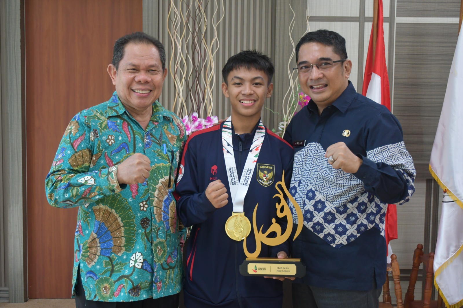 “Hari ini adalah kita ingin mengapresiasi dengan menerima Ananda kita yang telah menorehkan prestasinya di tingkat internasional di Dubai Juara I untuk silat junior,” kata Amujib.